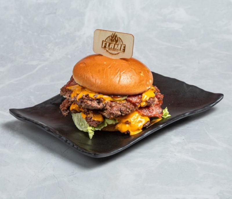 Ένα αληθινό μπιφτέκι Black Angus 100% με πλούσια συνοδευτικά: διπλό cheddar, τραγανό μπέικον, αγγουράκι πίκλα, καραμελωμένο κρεμμύδι, μαγιονέζα, και την απίστευτη σάλτσα BBQ μας.